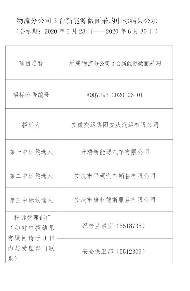 物流分公司3臺新能源微面采購中標結果公示