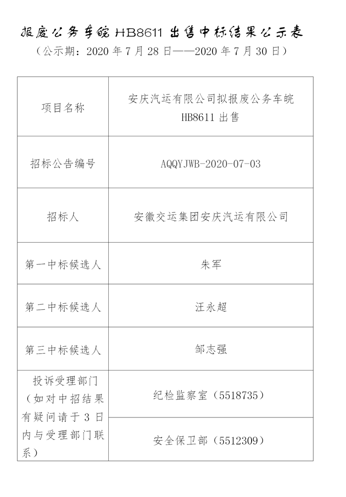 報(bào)廢公務(wù)車皖HB8611出售中標(biāo)結(jié)果公示
