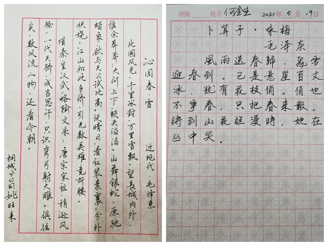 童安校車開(kāi)展“翰香獻(xiàn)禮,感念黨恩”紅色詩(shī)詞書(shū)寫活動(dòng)。通過(guò)書(shū)寫《卜算子·詠梅》《沁園春·雪》《七律·長(zhǎng)征》等經(jīng)典紅色詩(shī)詞,傳承紅色基因,發(fā)揚(yáng)紅色精神。