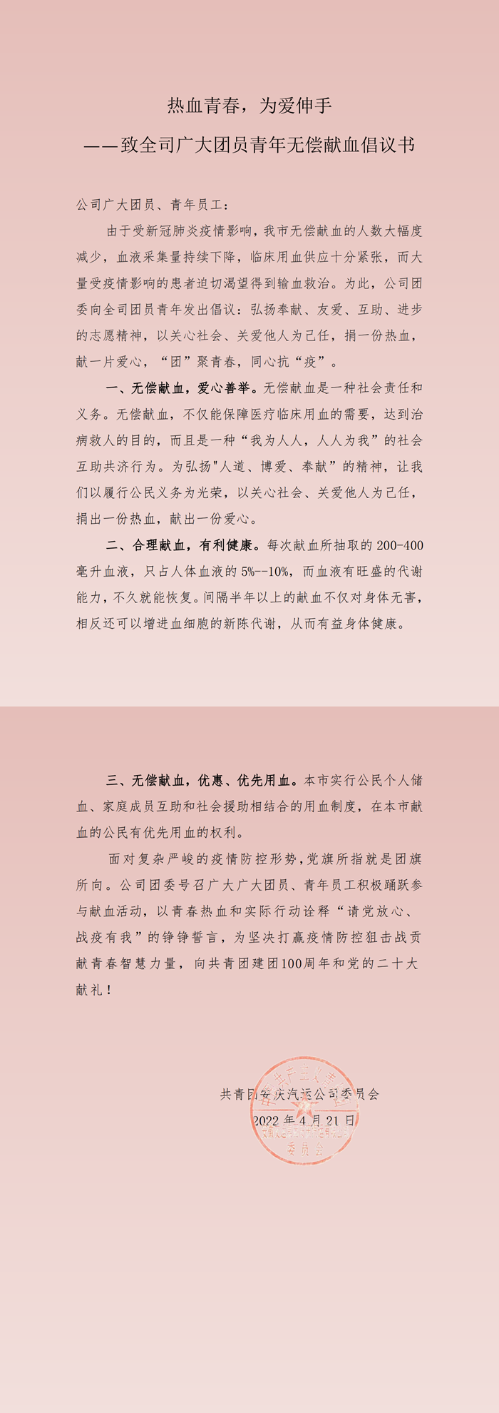 致全司廣大團(tuán)員青年無(wú)償獻(xiàn)血倡議書
