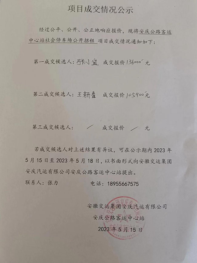 安慶中心站社會(huì)停車(chē)場(chǎng)公開(kāi)招租結(jié)果公示