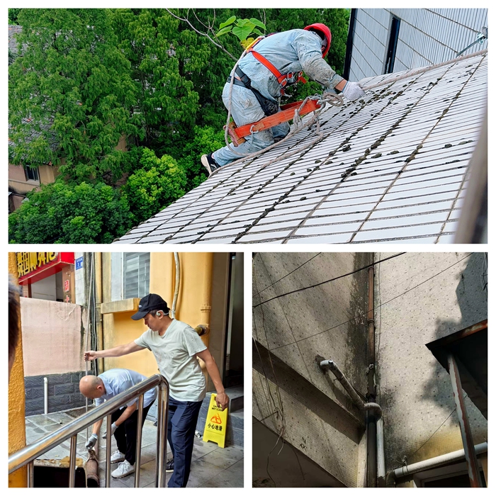 8月安全巡查期間,綜合服務(wù)中心安全科針對紡織南路7號樓及周邊區(qū)域開展專項隱患排查,發(fā)現(xiàn)兩處亟待處理的安全問題:一是7號樓公廁外側(cè)落水管多處破裂,導(dǎo)致雨水滲漏至路面并形成大面積積水,不僅影響市容環(huán)境,更對過往車輛及行人構(gòu)成潛在風(fēng)險;二是慶達綜合樓頂層臨街面瓷磚多處開裂,縫隙中滋生的灌木根系已侵入建筑結(jié)構(gòu),存在高空墜物隱患,嚴重威脅公共安全。